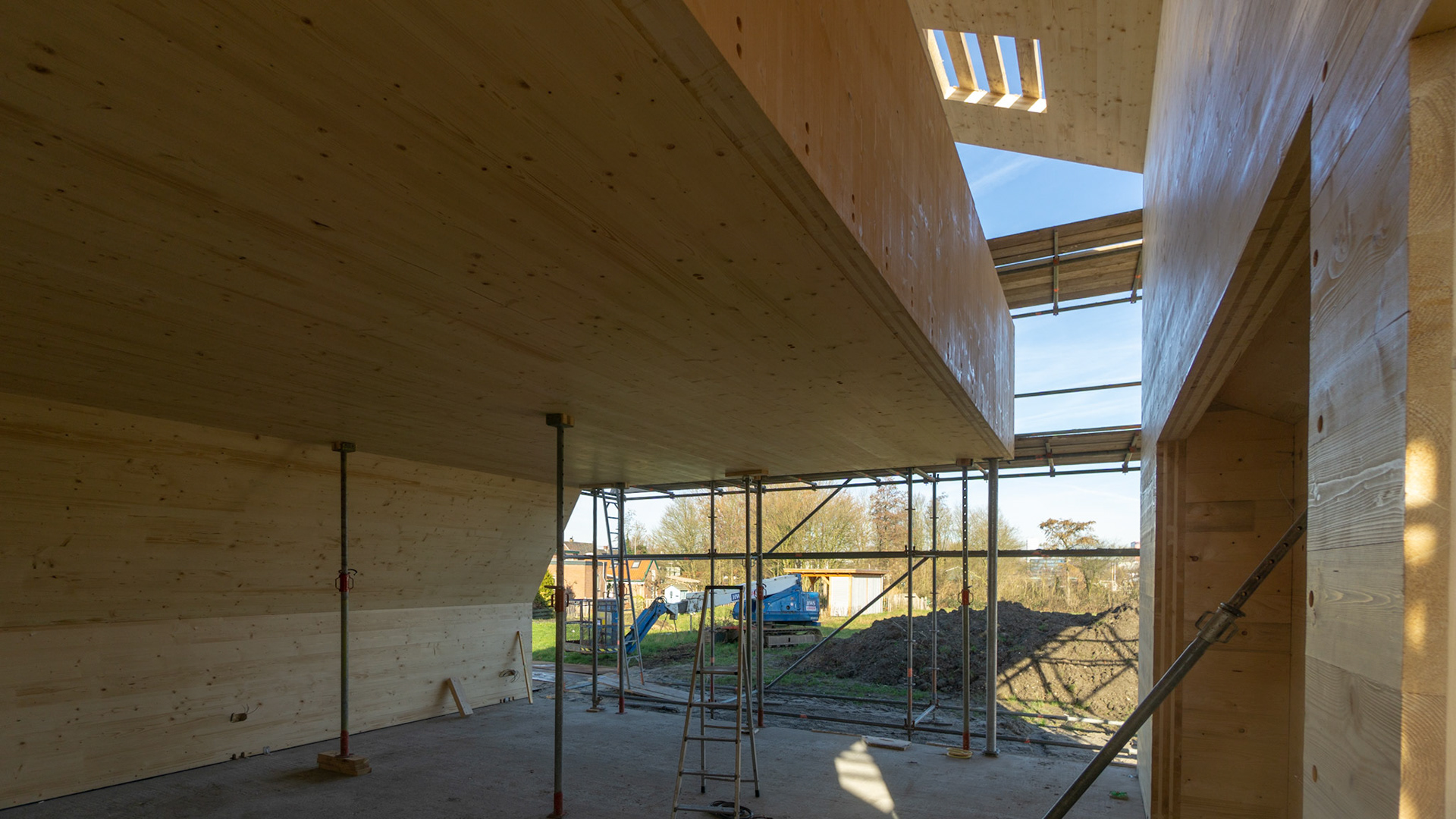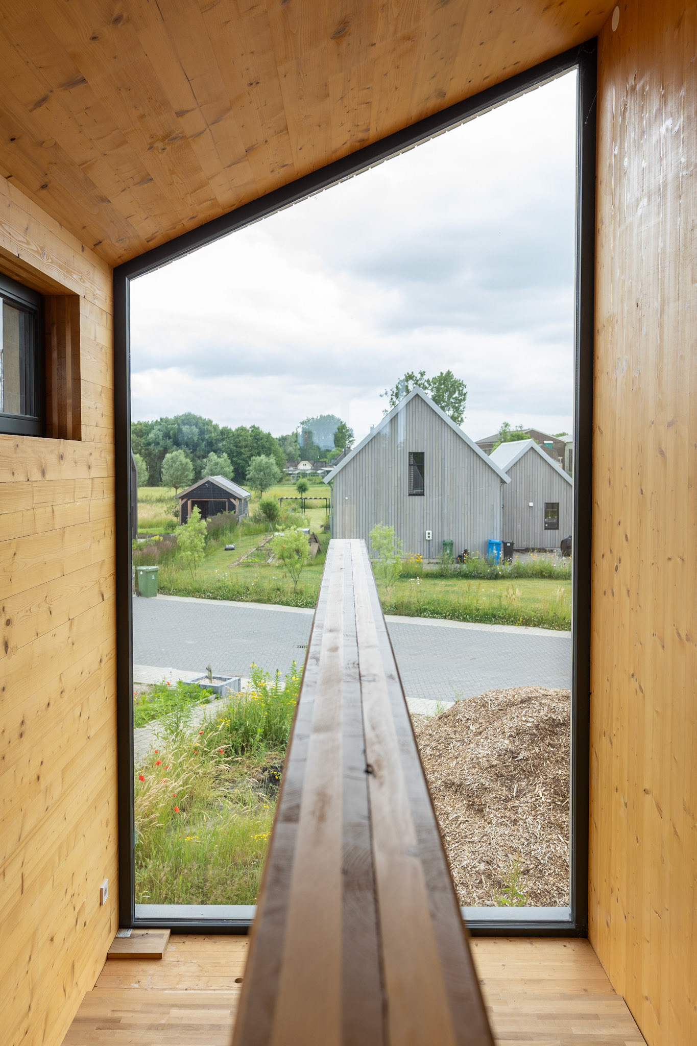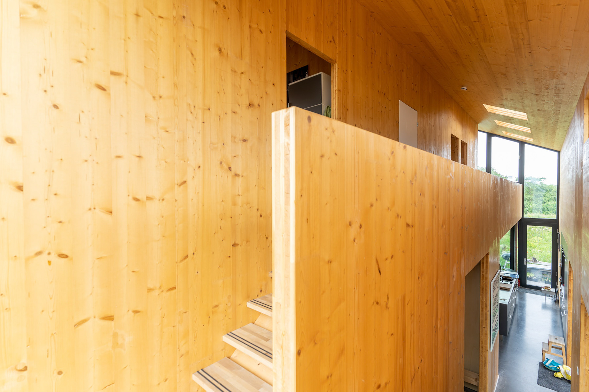 Deze woning is met kruislaaghout gebouwd. Hiermee is het mogelijk om een vide in langsrichting van de woning te maken, en gevelopeningen van wand tot wand en vloer tot plafond. Team: Job Schroën en Mauric Bohle